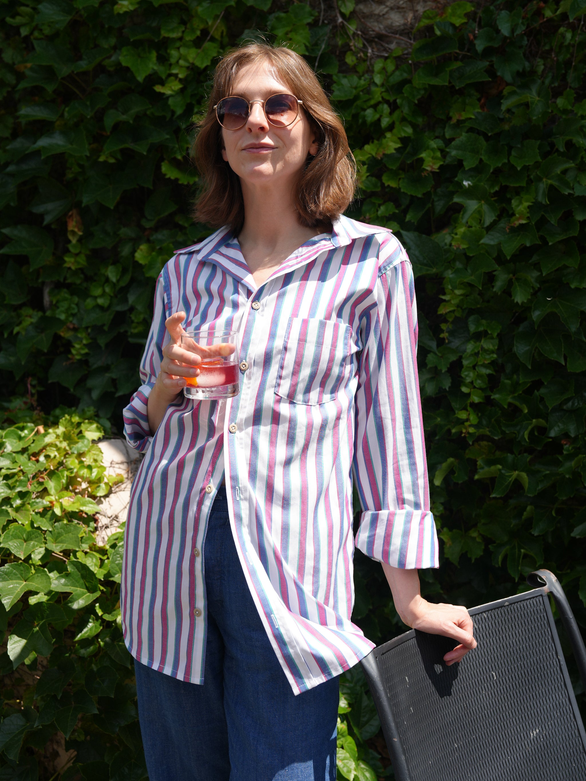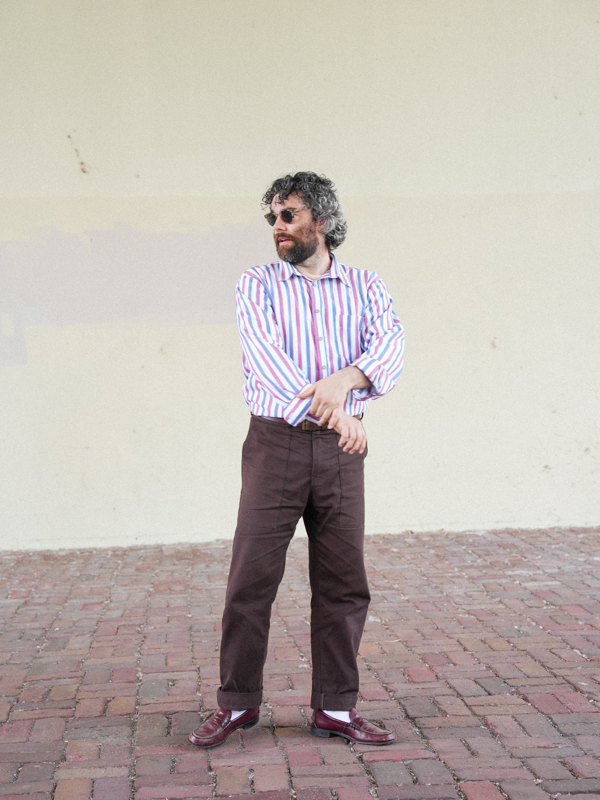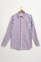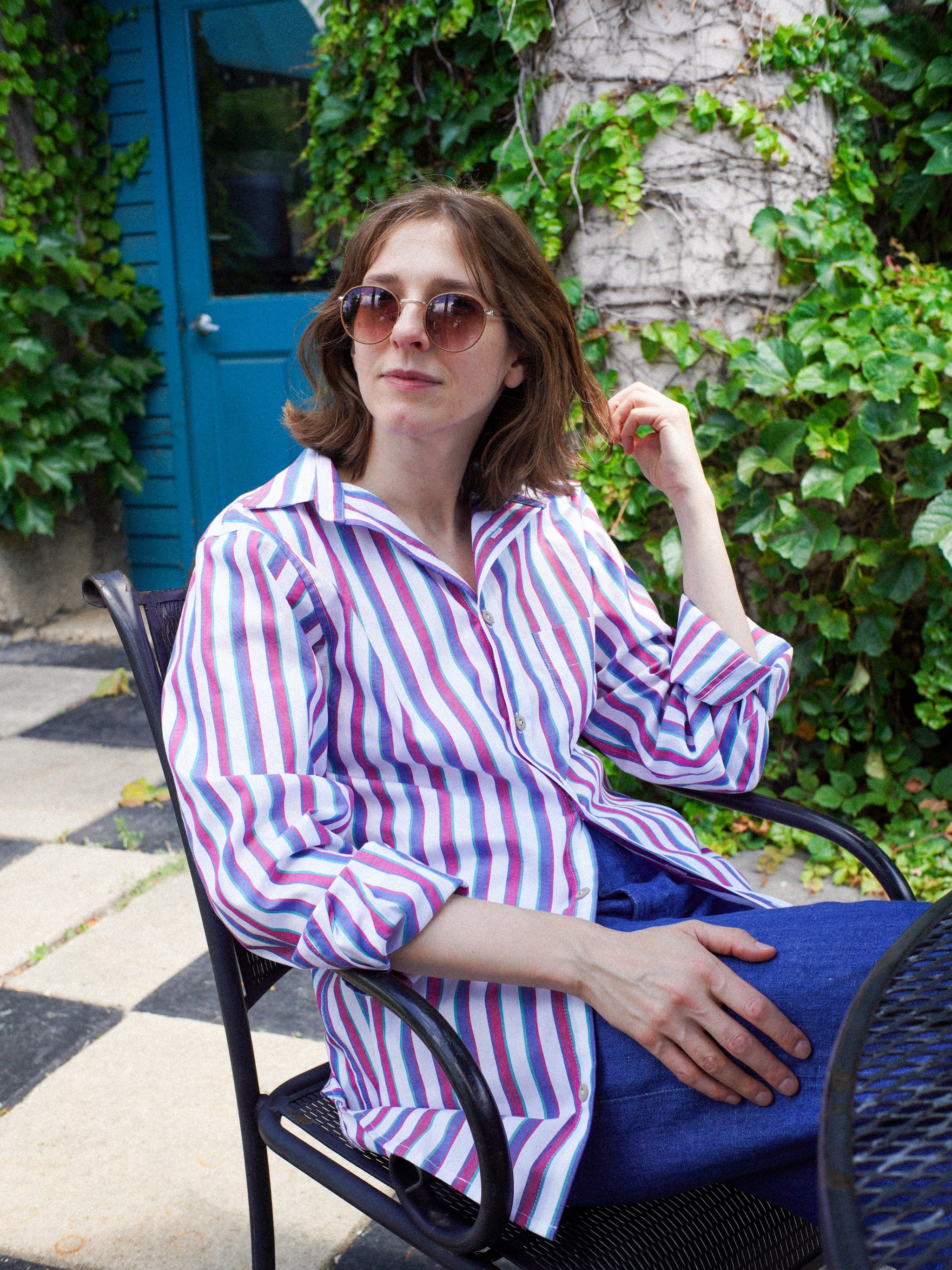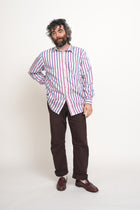 The Button Up Shirt is like a classic oxford shirt in that it goes great with a tie and jacket to achieve an ivy league approach, or loose and open like a late night work party. A roomy fit with a tuck-able length. Made from a 4 color stripe cotton. An essential garment with a courageous stripe so you can work while everyone is watching.