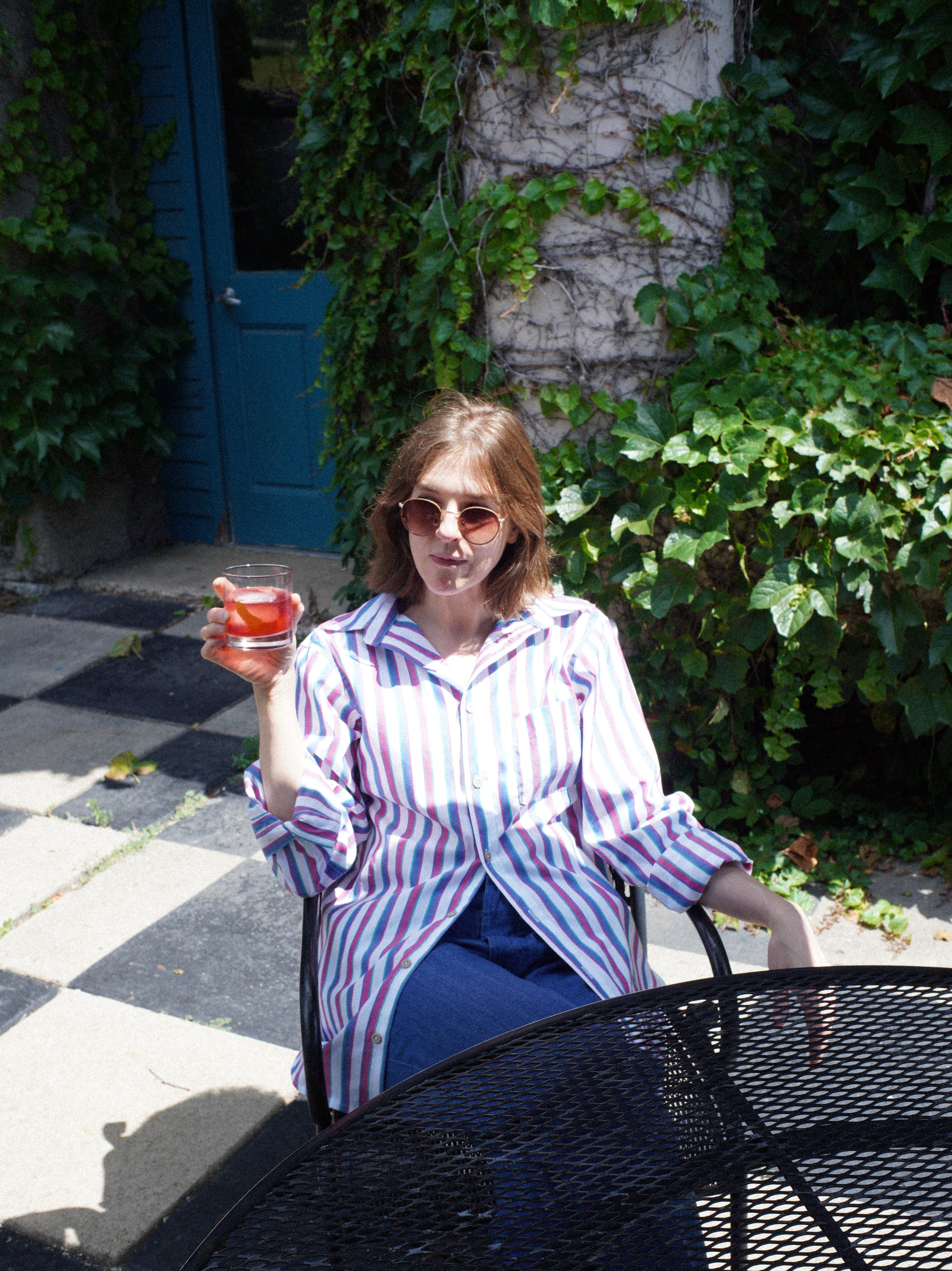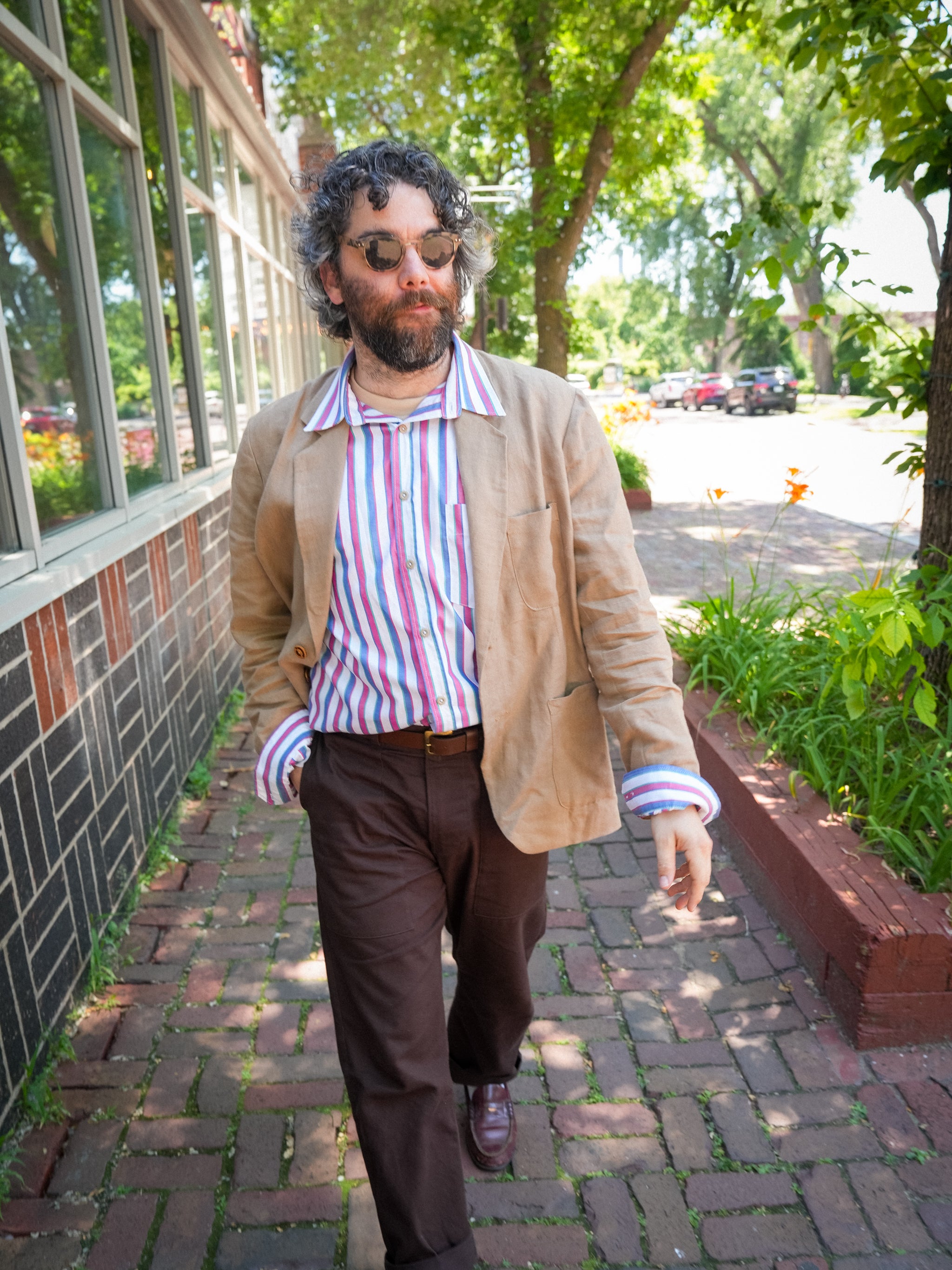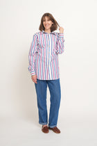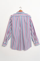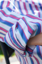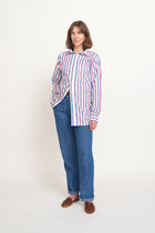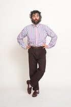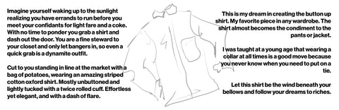 The Button Up Shirt is like a classic oxford shirt in that it goes great with a tie and jacket to achieve an ivy league approach, or loose and open like a late night work party. A roomy fit with a tuck-able length. Made from a 4 color stripe cotton. An essential garment with a courageous stripe so you can work while everyone is watching.